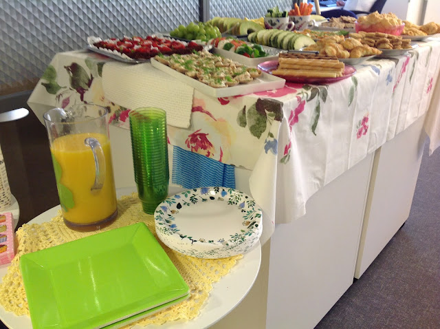 Ajattelin yllättää työkaverini aamu brunssilla ja onnistuinkin siinä aivan hyvin. Kyllä monien ilmeissä oli katselemista ja se hauskuutti kyllä brunssin tekijää. Brunssin suunnitteluun pitää käytttää vähän aikaa ja toki vaivaakin, jotta siitä saa hyvän. Itse leipomalla myös brunssin saa edullisemmin, ja tällä viikolla sattui lähi K-kaupassani olemaan hedelmät 1€/kg joten nekään ei tulleet kalliiksi. Ja kattaus on puoliruokaa, joten minäkin toin kotoa pöytäliinan ja astioita. Myös värien maailma onnistui mukavasti, pöytä vaikutti kutsuvalta. Pöytä rakennettiin kaapistoista, joka toimi tosi hyvin tähän tarkoitukseen. Brunssi teki hyvin kauppansa ja illalla kotiin lähtiessä oli vain tyhjät astiat tuliaisina.
